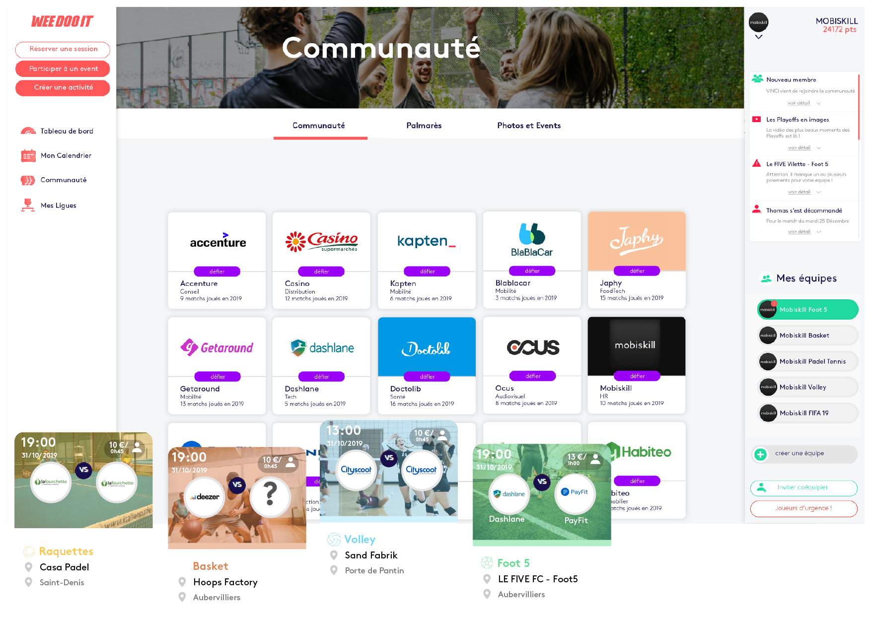Des matchs à organiser de manière flexible contre les entreprises de la communauté Un avant-goût de tout ce que Weedooit vous permet de faire
